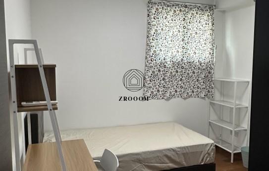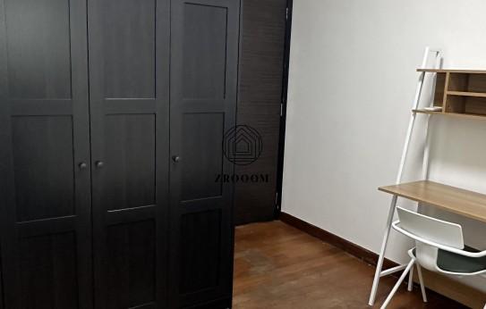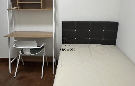 The room comes with a super single-size bed, study desk with shelving unit and chair, and a large wardrobe offering generous storage.