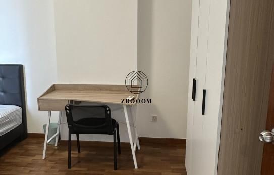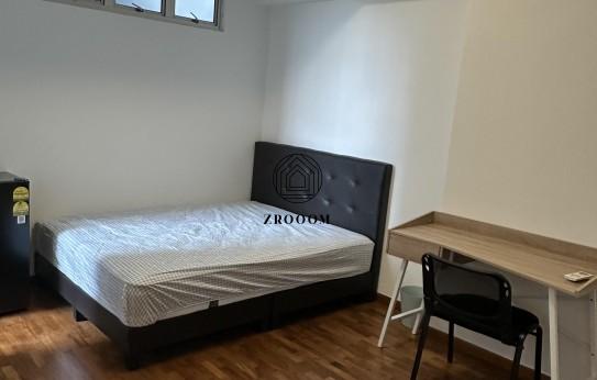 The room is well furnished with a queen size bed, study desk with chair, a large wardrobe, and a personal fridge, providing both comfort and convenience for everyday living. The generous layout allows plenty of room for movement, making the space feel open and comfortable for rest, work, or study.