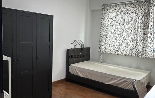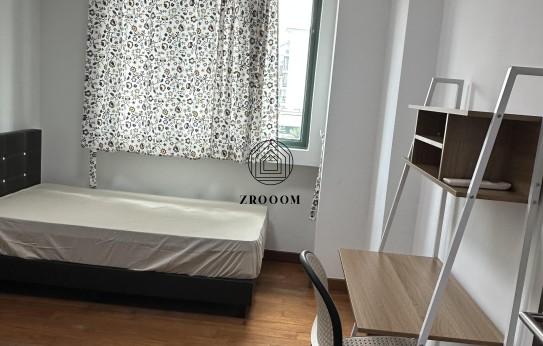The room comes with a super single-size bed, study desk with shelving unit and chair, and a large wardrobe offering generous storage.